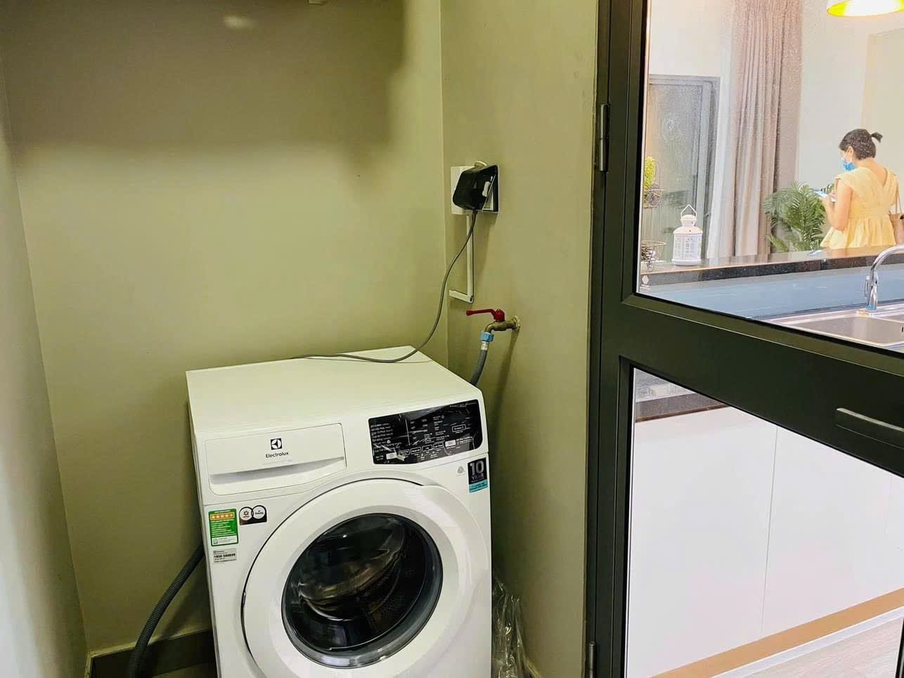 This unit features a separate laundry loggia attached directly to the kitchen for excellent ventilation. It comes equipped with a reliable Electrolux Front-Load Washer and ceiling-mounted hang drying racks to save space.