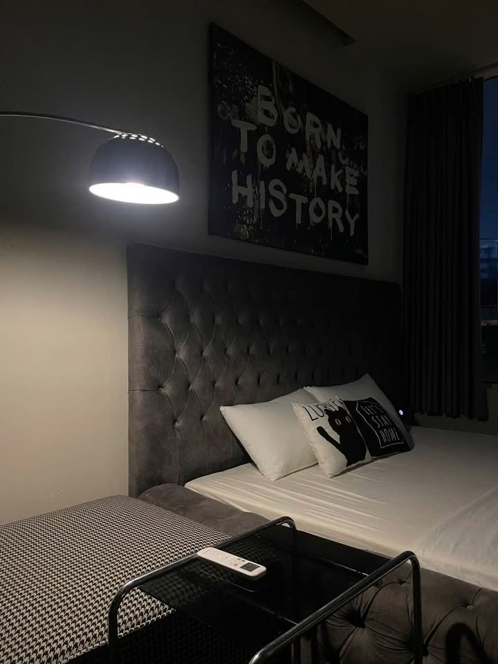 Modern Aesthetic: The interior features a striking, bold, and luxurious look with dark wood floors, tufted velvet furniture, and high-contrast artwork (like the “Born to Make History” piece) .