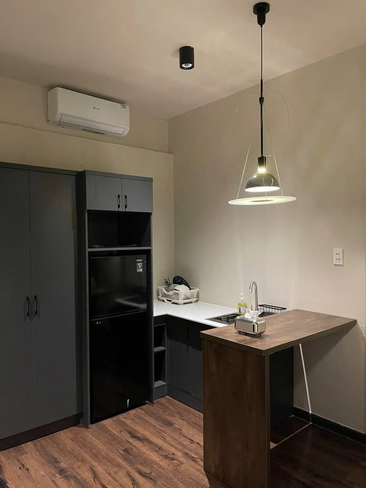 Fully Equipped: Includes a functional kitchenette with a refrigerator and built-in bar counter, plus high-quality fixtures in the bathroom.
