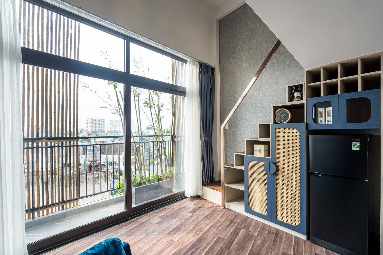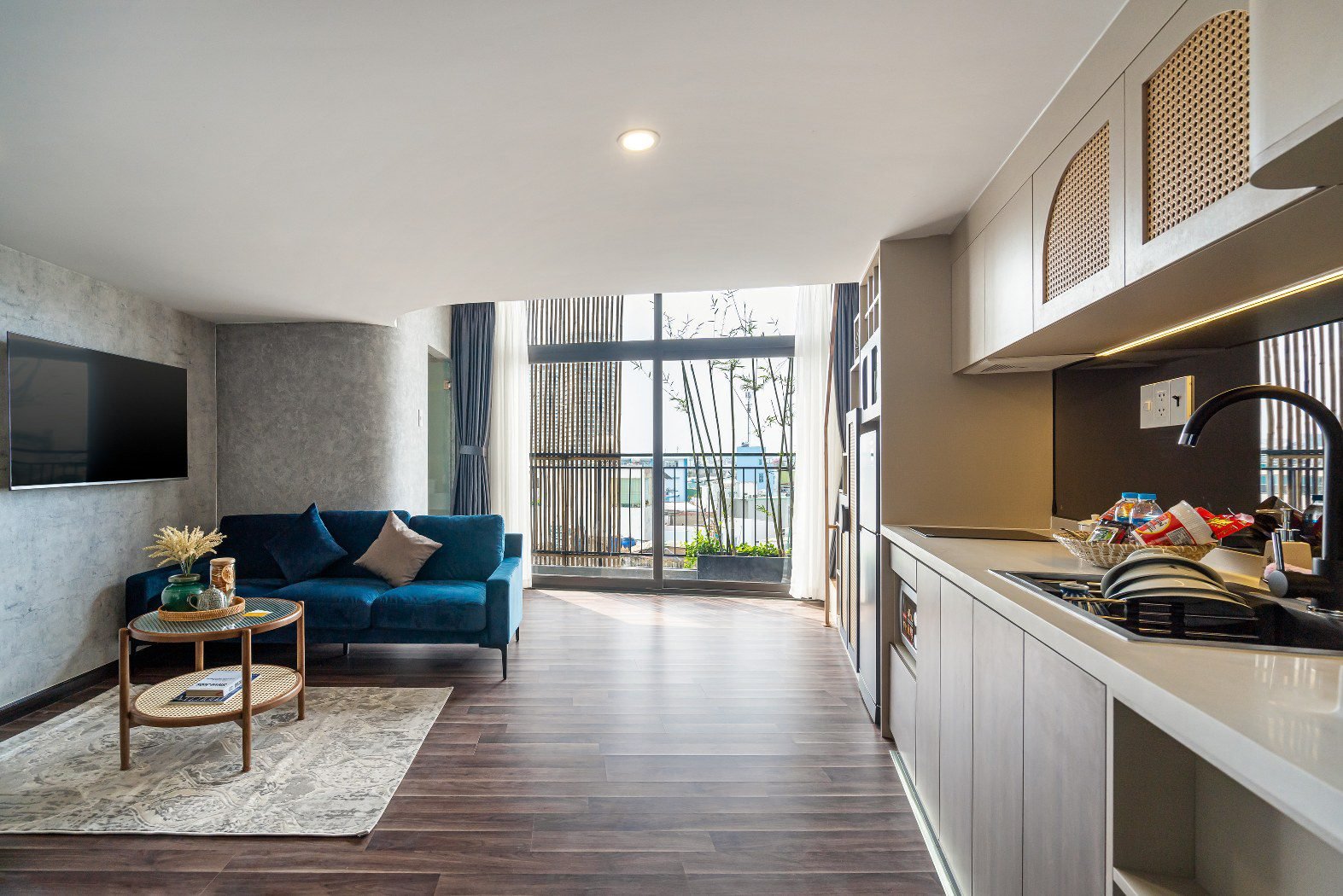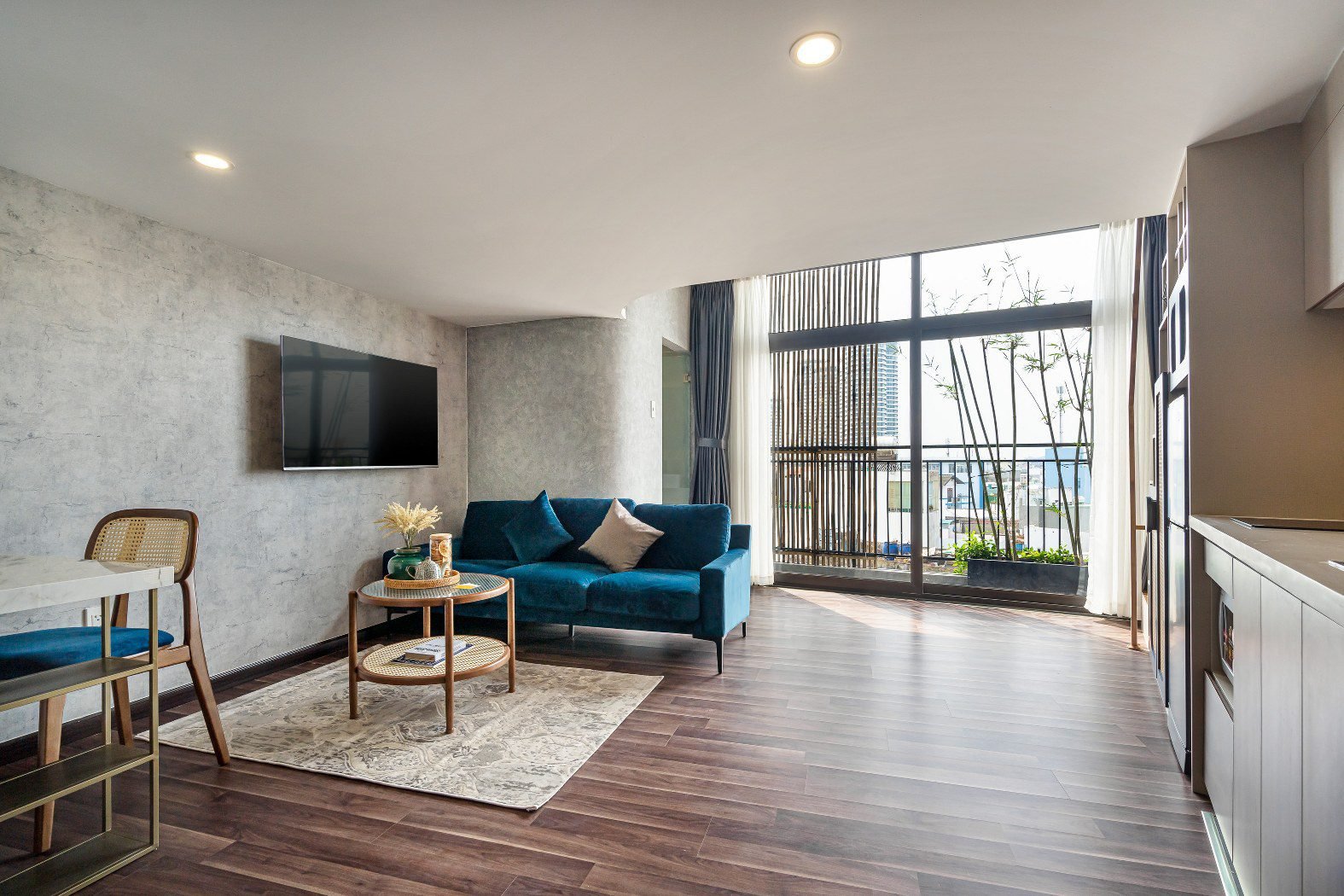 - 🌿 Large Balcony: Floor-to-ceiling sliding doors open up to a generous balcony, flooding the workspace and living area with natural light.