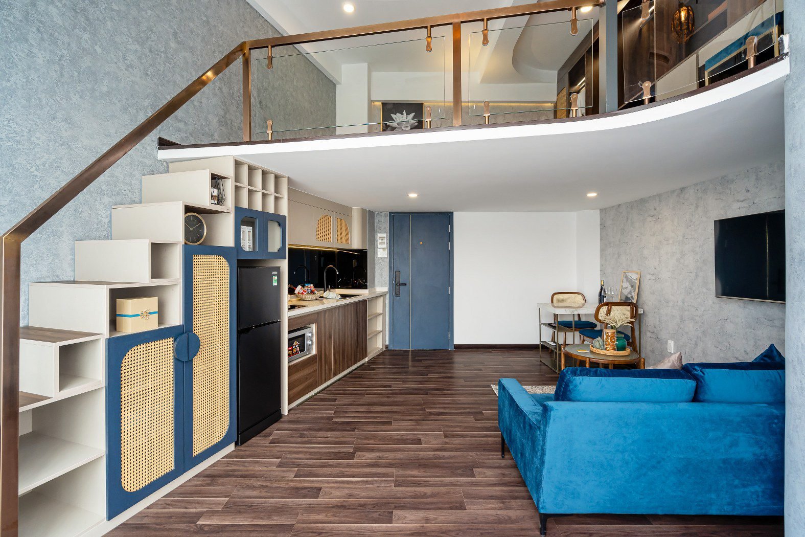 Upgrade your work-from-home setup in this **Spacious Duplex Studio**. Designed with a wider, more open footprint than standard units, this apartment flows seamlessly from a modern kitchen to a bright living area. The defining feature is the **Upper-Level Workstation**—a dedicated large desk overlooking the living space, perfect for focus and productivity.