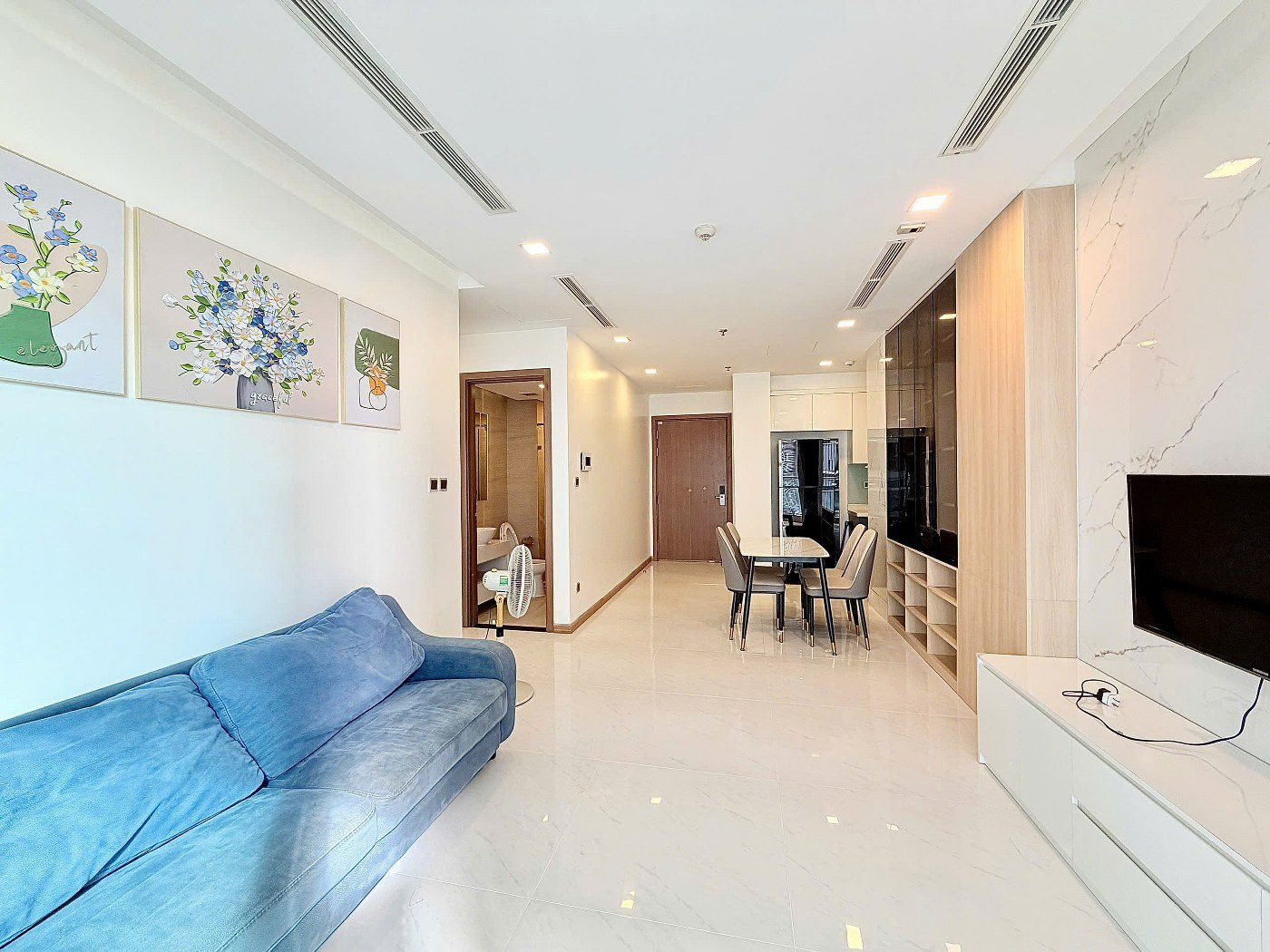 - 🛋 Bright & Spacious: The living room features cool tile flooring, a marble feature wall, and a comfy grey sofa, leading out to a breezy balcony.
