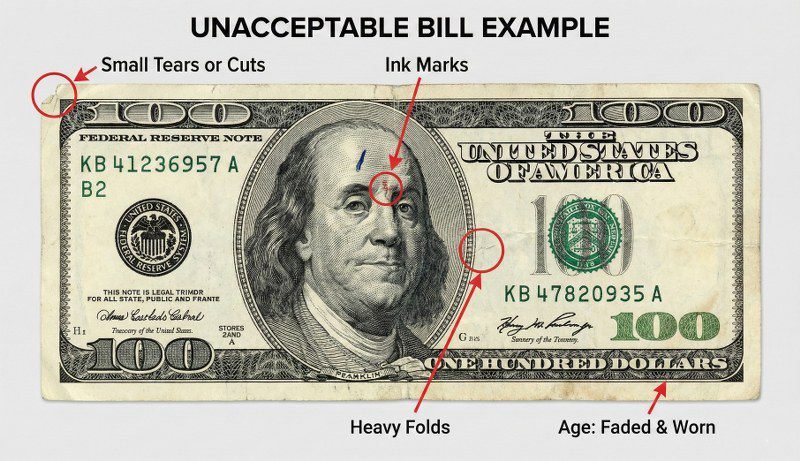 • Age: Older series bills (pre-2013 for USD) are often rejected or exchanged at a lower rate.